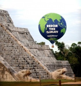 En las fotos se ve a activistas de Greenpeace sobrevolando las pirámides de los Mayas. Este pueblo nos legó el TZOLKIN, la cuenta sagrada 13:20 que nos recuerda que el tiempo es la clave para salir del atolladero. El tiempo no es dinero, el tiempo es uno solo, es el presente, es arte, es ahora.
