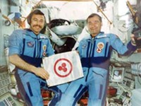 (Foto: La bandera de la Paz, en el espacio exterior llevada por los astronautas A.Balandin y A.Soloviov el año 1990 quienes llevaron La Bandera de la Paz al Cosmos. Desde febrero hasta agosto la Bandera se encontraba al bordo del complejo orbital pilotado «MIR» y ha sido sacada de la nave al Cosmos, donde permaneció 9 días e hizo 144 giros alrededor de la Tierra.