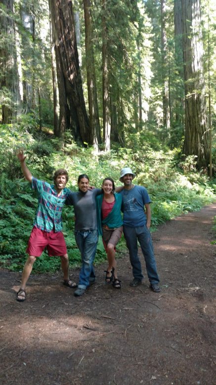 Esta es una foto dentro de un bosque de sequoyas. Arboles milenarios y frondosos… los mas grandes del mundo. Altaira y Sean nos acogieron en su comunidad por varios dias, en Oregon y compartimos un viaje a la montana y luego, en esta foto del ultimo dia… un viaje al bosque costero de Oregon, que esta en frontera con California. Con Altaira, Sean y Lanpu