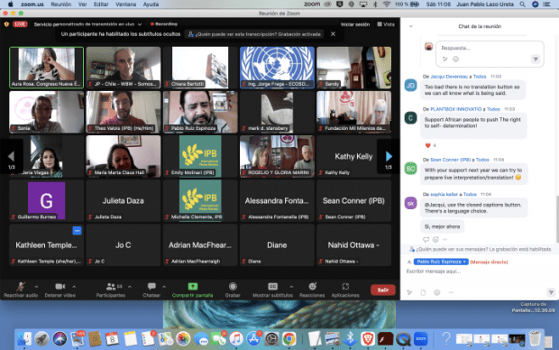 La excusa de la convocatoria es que en los próximos días se reúne la OTAN, «la máquina belicista» como fue tildada por una panelista en la transmisión vía zoom y streaming del movimiento para acabar con todas las guerras.