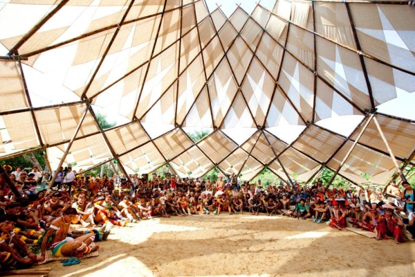 Fantástica fotografía del comienzo de la aventura en que se reúnen los pueblos. Le hemos llamado La Cúpula dos Povos. Cerca, se desarrolla la cumbre de Río+20. Cerca, también, se realiza la cumbre del Consejo de Asentamientos Sustentables de América. ¡Qué maravilla! Desde acá, pulsamos que se realice una Bandera Humana de la Paz con ocasión de la cumbre. Al menos, pedimos nos envíen fotografías de la bandera y de su presencia en esta cita planetaria.