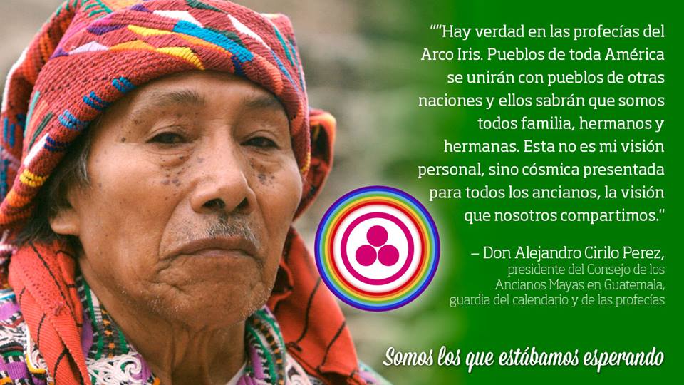 Oh Shinnah, mujer medicina de origen Tineh (Apache), Mohawk y escocesa, Brook Medicine Eagle, hija del arco-iris, mujer medicina Lakota y Crow, Alejandro Cirilo Pérez, guardián del calendario, Pdte. del Consejo de Ancianos Mayas de Guatemala, y también guardián de las profecías y un extracto de la profecía de los Anishnabes nos dan cuenta del pronunciamiento idéntico que existe con la fuerza del Arco-Iris.